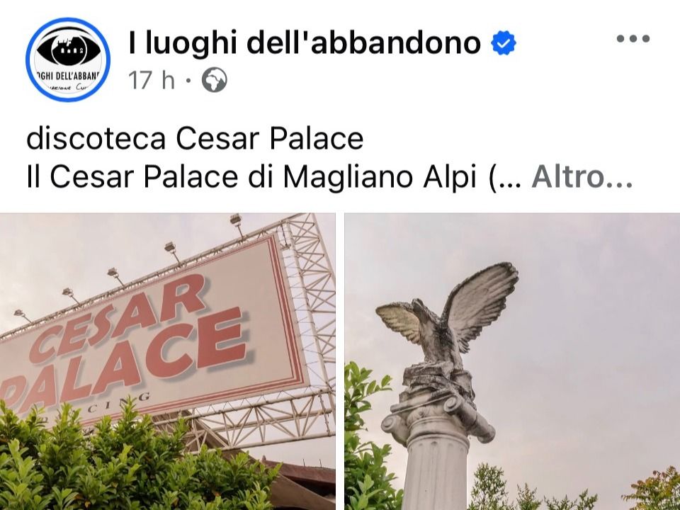«Il Cesar Palace di Magliano Alpi è stata una leggendaria discoteca degli anni 70–2000, simbolo della vita notturna. Inaugurato nel 1975, noto precedentemente come Ippodromo, era una struttura avveniristica da 8.000 persone su quattro livelli, nota per i concerti di artisti famosi… e attiva fino al 2007», si legge nel testo che accompagna le immagini.