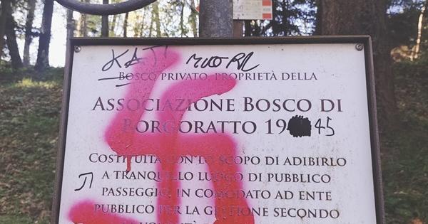 Il cartello vandalizzato all'ingresso dei Boschetti