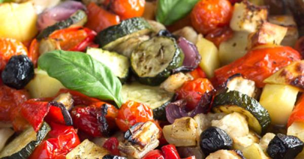 2 Zucchine, 1 Melanzana, 3 Patate, 2 Peperoni, 10 Olive nere, 10 Pomodorini, 1 Cipolla, Origano, Sale, Olio