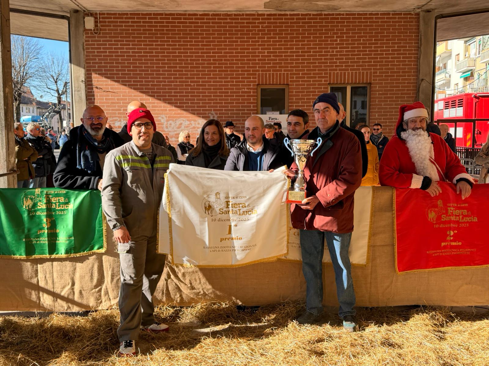 L'edizione numero 60 della Fiera di Santa Lucia ha confermato non solo la sua longevità storica, ma anche una rinnovata vitalità ed un'altissima qualità dei capi esposti, con 49 capi in concorso. Massimo Gula, veterinario dell'ASL presente con Emanuele Peirone, responsabile dell'area mercatale della Fiera, ha espresso grande soddisfazione, sottolineando due punti di forza: "Innanzitutto, c'è una serie di giovani allevatori che sta investendo sul territorio per mantenere alta la qualità dei bovini di razza piemontese. In secondo luogo, siamo giunti alla 60esima edizione con uno spirito di innovazione costante per continuare a lavorare bene e con qualità. Con 49 capi in mostra, siamo tornati ad ottimi livelli, segno di un'alta qualità complessiva". L'eccellenza della filiera è stata celebrata con diversi riconoscimenti. Il prestigioso Premio Città di Ceva - nella foto sotto - è andato all'esemplare dell’Az. Agricola Canavese di Ceva (Macello Perego di Priero e Macelleria Canavese).
