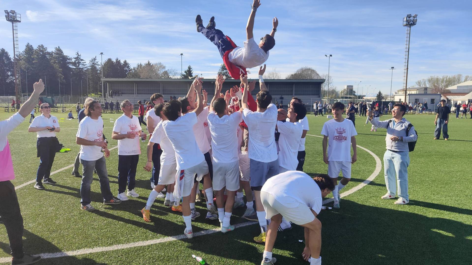 Serviva una vittoria nello scontro diretto con la Saviglianese per coronare il sogno Eccellenza (categoria che a Mondovì mancava dal 2016). Oggi, sul sintetico del Centro Sportivo Monregale in corso Francia, i ragazzi di Michele Magliano - sotto mentre viene sollevato al cielo - sono riusciti ad incantare i "Maghi" dell'ex tecnico Franco Giuliano. Avvio shock con la rete dell'ospite Chelarescu, poi nel giro di pochi minuti nella ripresa su due cross di Porcaro dalla sinistra i "galletti" ribaltano tutto: 1-1 di Magnino che stoppa e piazza la zampata sul secondo palo e 2-1 con Mulassano che svetta ed incrocia di testa. La chiude il "toro" Vella con una percussione centrale mettendo il sigillo sul match
