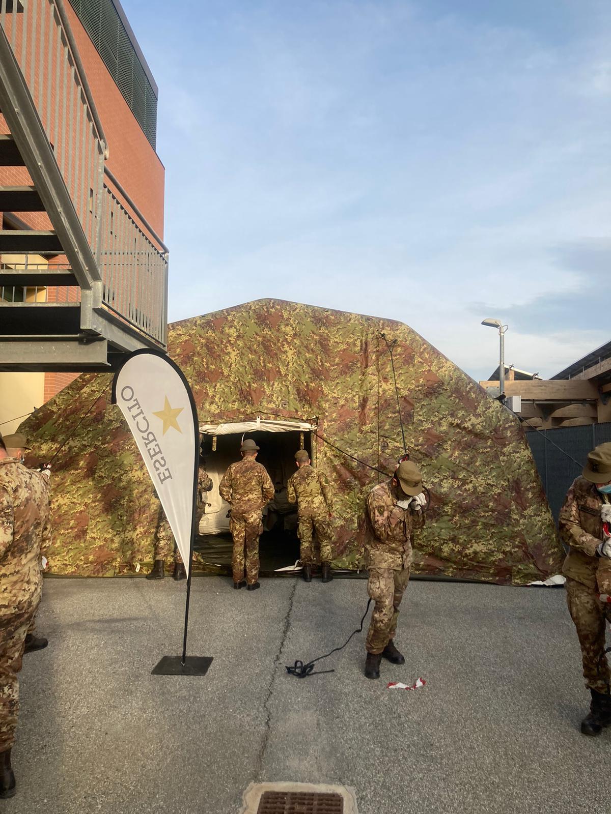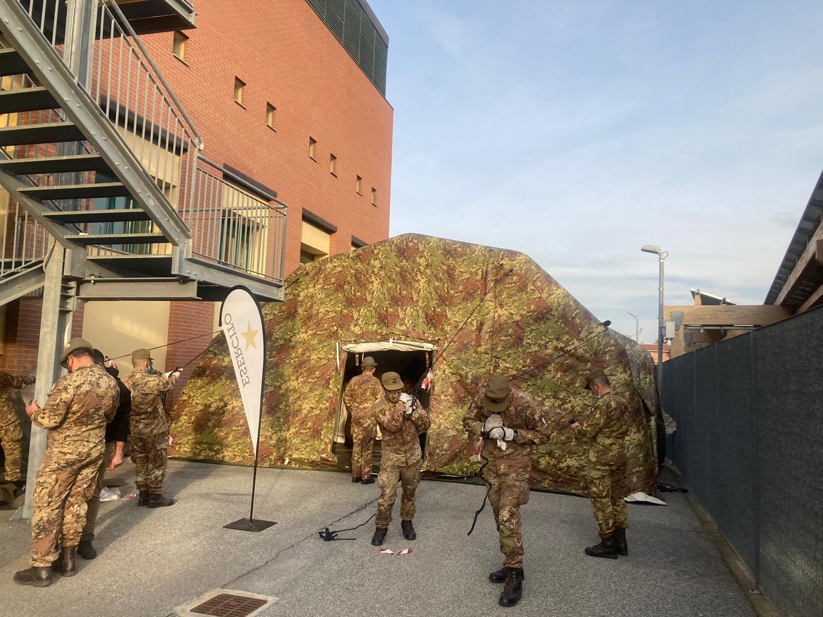Nella foto, gli uomini dell'Esercito impegnati nel montaggio della struttura a Savigliano