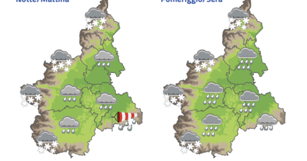 Quota neve in calo fino ai 900-1000 m sul Cuneese e 1200 m sugli altri settori alpini. Intensità in attenuazione nella notte.