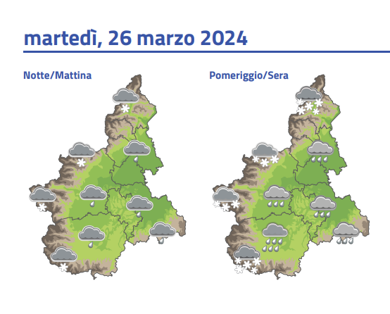 nel pomeriggio; fenomeni localmente forti sulle zone alpine, più persistenti sul settore sudoccidentale. Quota neve sui rilievi alpini sui 1000-1200 m, localmente fino a 700-800 m sull'Appennino cuneese. Zero termico: in aumento sui 1500-1700 m, con valori sui 2000-2200 m a sudest. Venti: moderati o localmente forti da sudest sulle Alpi in intensificazione dal