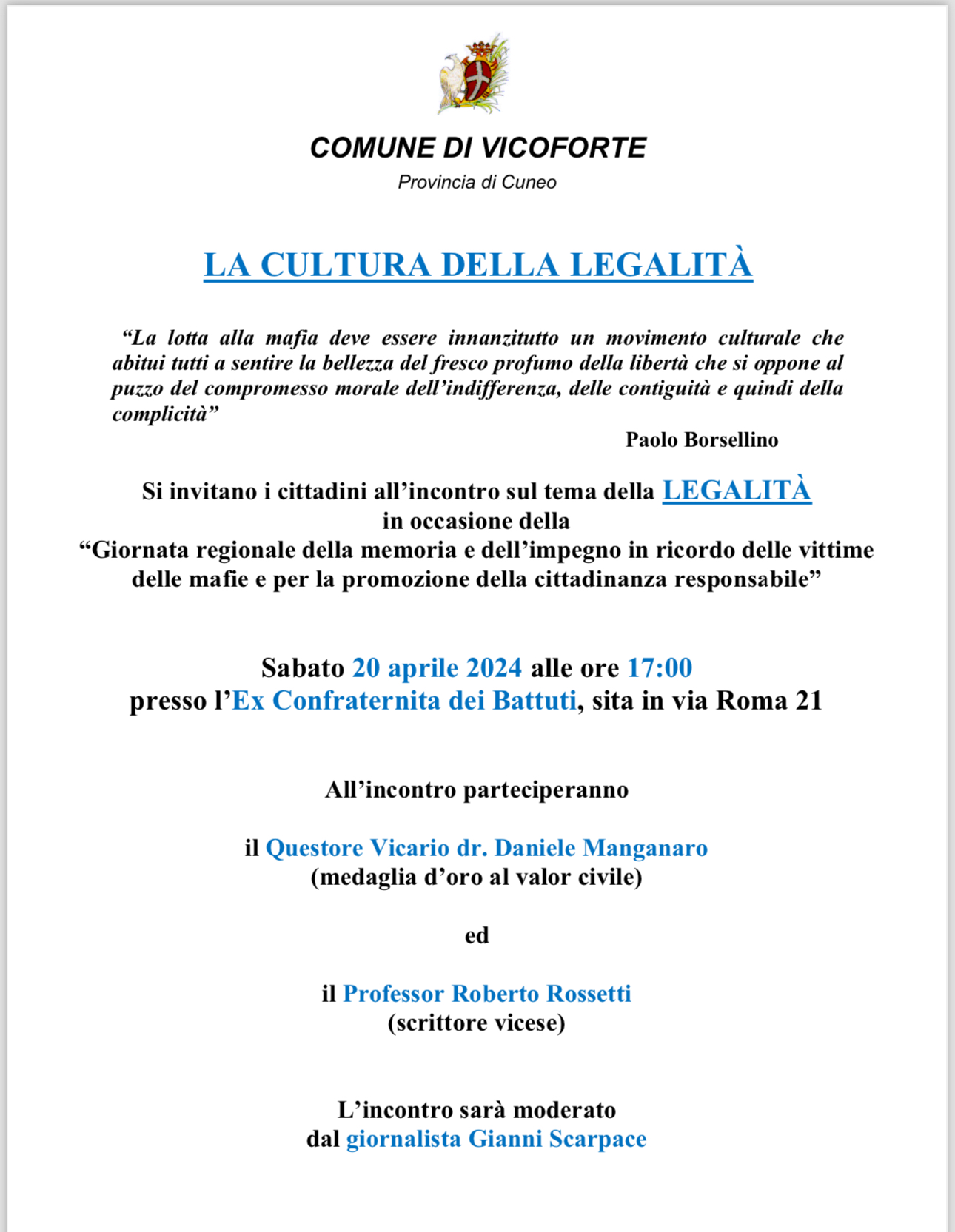 il Comune di Vicoforte aderisce alla “Giornata regionale della memoria e dell’impegno in ricordo delle vittime delle mafie e per la promozione della cittadinanza responsabile”. Lo farà con un importante evento, in programma sabato 20 aprile alle 17, alla ex Confraternita dei Battuti.