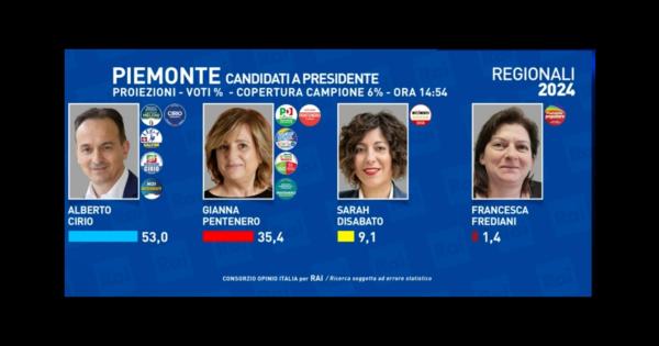 La conferma dei risultati si avrà in giornata dopo la conclusione dello spoglio che è iniziato alle 14. La prima proiezione ufficiale per le elezioni regionali in Piemonte e si può dire che il presidente uscente, Alberto Cirio, sarà di nuovo presidente. Il candidato del centrodestra secondo le stime del consorzio Opinio per Rai, è in netto vantaggio sugli sfidanti: ha il 53%, contro il 35,4 di Gianna Pentenero (centrosinistra), mentre Sarah Disabato (Movimento 5 Stelle) si ferma al 9,1%. Francesca Frediani (Piemonte popolare) è all’1,4%. Non rilevato dagli exit poll l’ultimo sfidante, Alberto Costanzo, della lista Libertà.