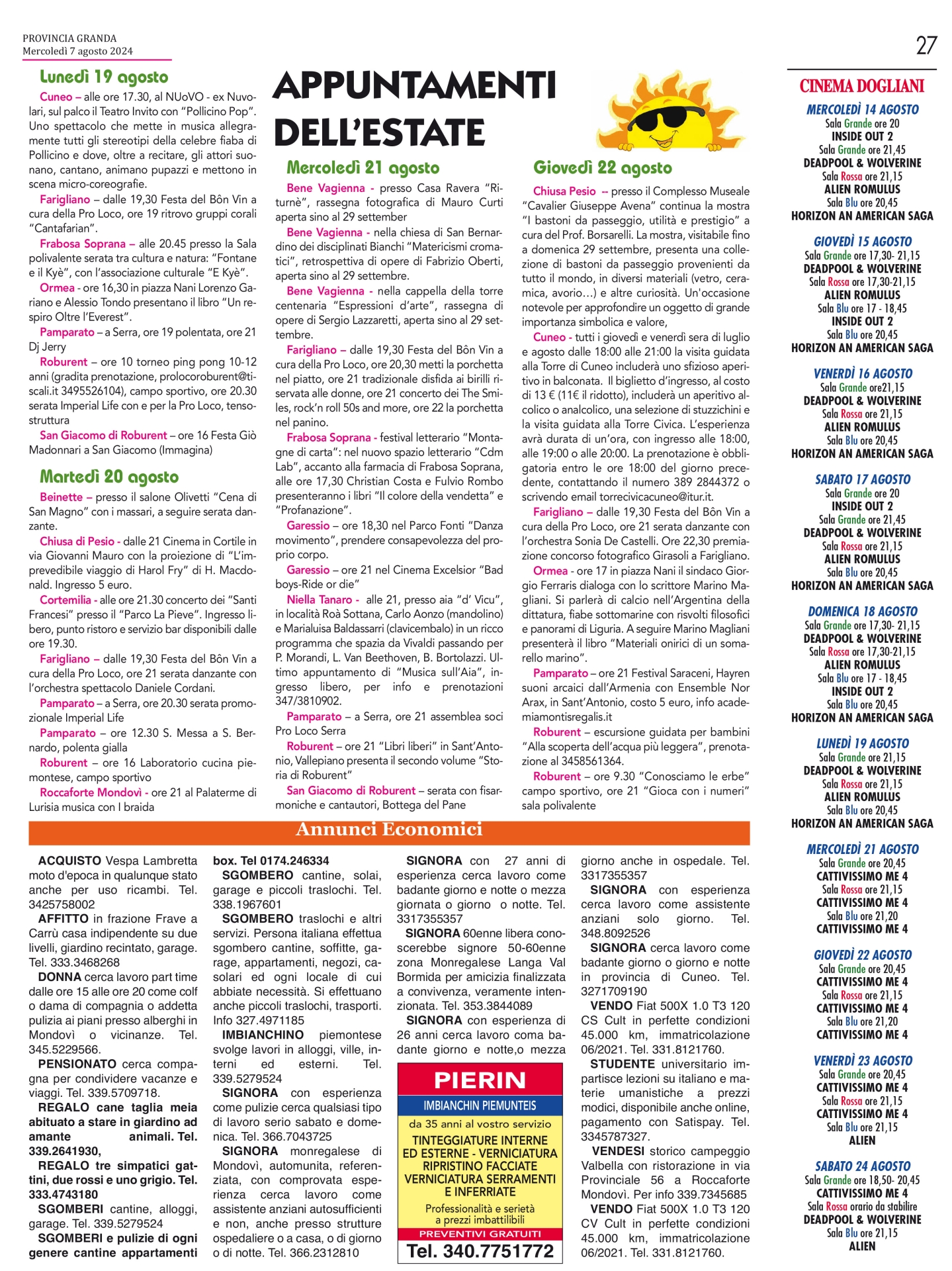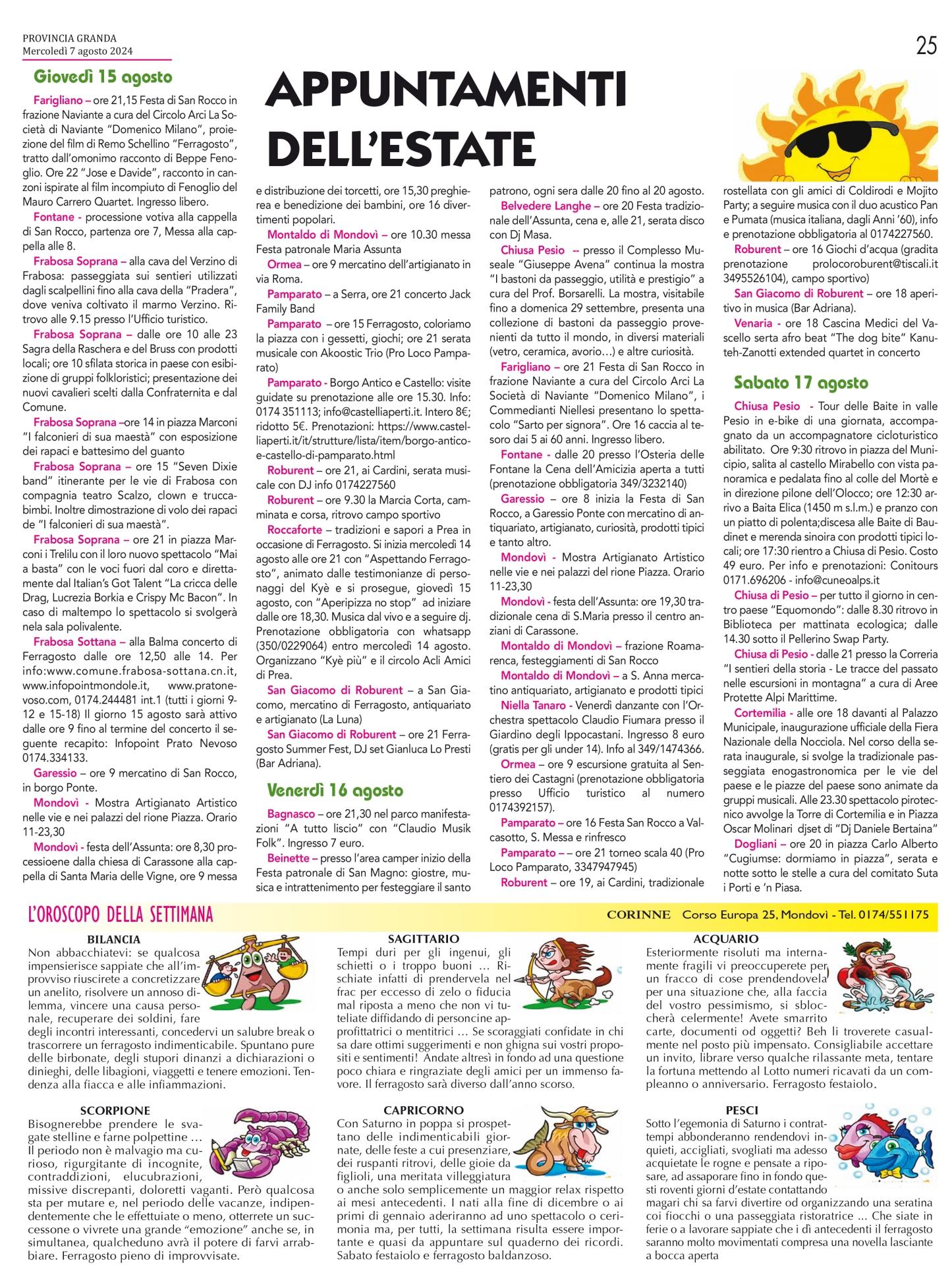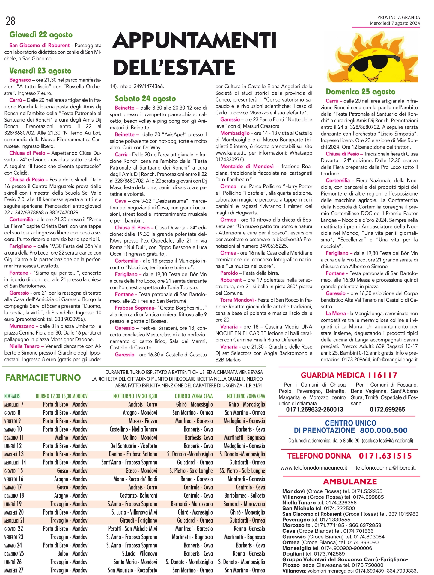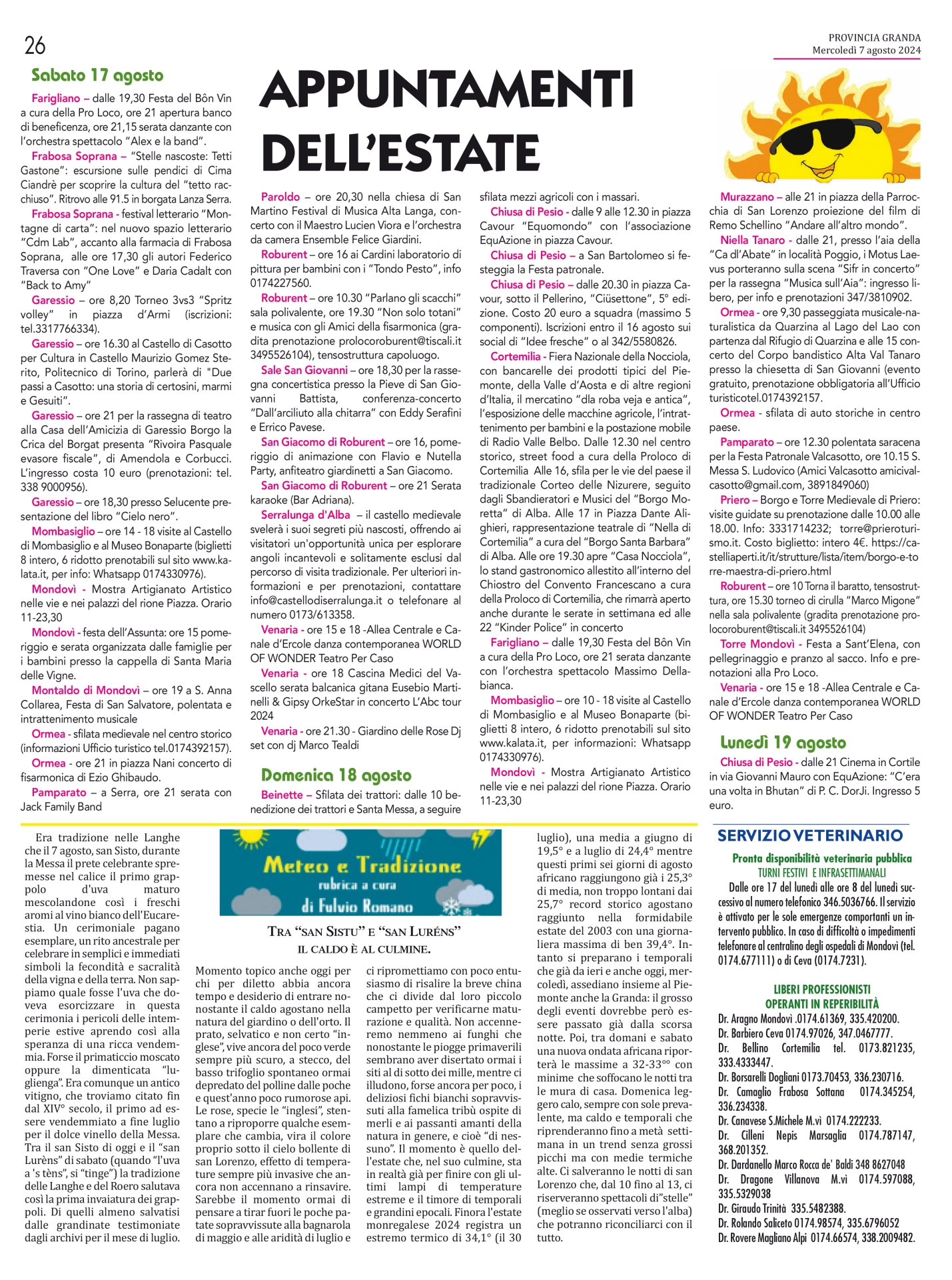 Il Buon Ferragosto ai nostri lettori lo esprimiamo ricordando che a Mondovì e su tutto il territorio del Monregalese e del Cebano sono tanti gli appuntamenti per chi resta a casa e vuole confermare l'apprezzamento per le nostre zone. Rimandiamo alla nostra sezione eventi per i particolari (https://www.provinciagranda.it/sezioni/130/eventi) ricordando, kn particolare, la 56° edizione della Mostra dell'Artigianato di Mondovì, fino al 18 agosto, Concerto di Ferragosto a Prato Nevoso e Sagra della Raschera a Frabosa Soprana.