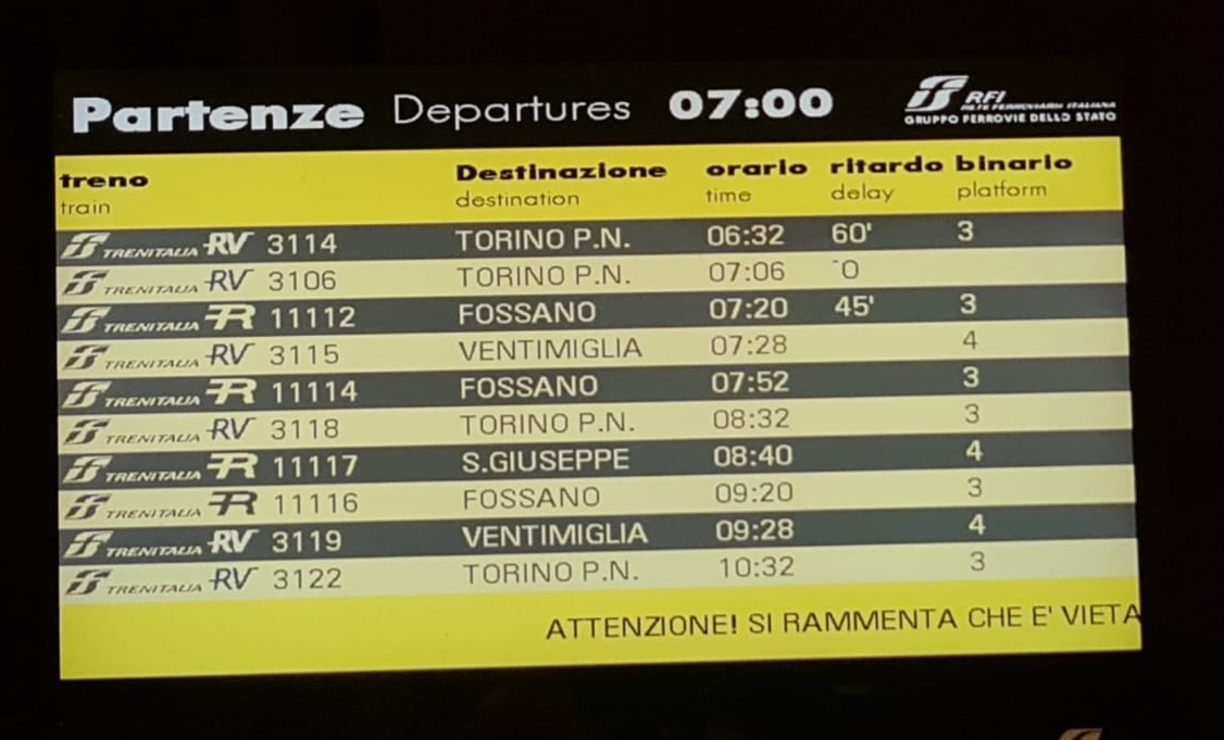 Decine di pendolari fermi in stazione a Mondovì ed a Ceva. Due treni diretti verso il capoluogo regionale cancellati, stessa sorte per un altro verso San Giuseppe di Cairo. Situazione difficile e molto nervosismo, stamattina (martedì), per chi deve raggiungere posti di lavoro e di studio in treno. I problemi sarebbero originati da lavori sulla tratta Ceva – Mondovì che per ora non sono ancora terminati. Il treno regionale 3114 a Mondovì atteso alle 6,32 diretto a Torino aveva 60 minuti di ritardo. Il convoglio 3106 per Torino (a Mondovì alle 7,06) è stato cancellato. Stessa sorte anche per 11112 diretto a Fossano (a Mondovì alle 7,20). Infine cancellato anche il regionale 11117 per San Giuseppe di Cairo (8,40 a Mondovì). Alcuni pendolari sono stati costretti a raggiungere in auto la stazione di Fossano per raggiungere poi Torino con il primo treno disponibile: fino alle 7,40 non erano presenti bus sostitutivi. Problemi anche sulla Cuneo - Torino.