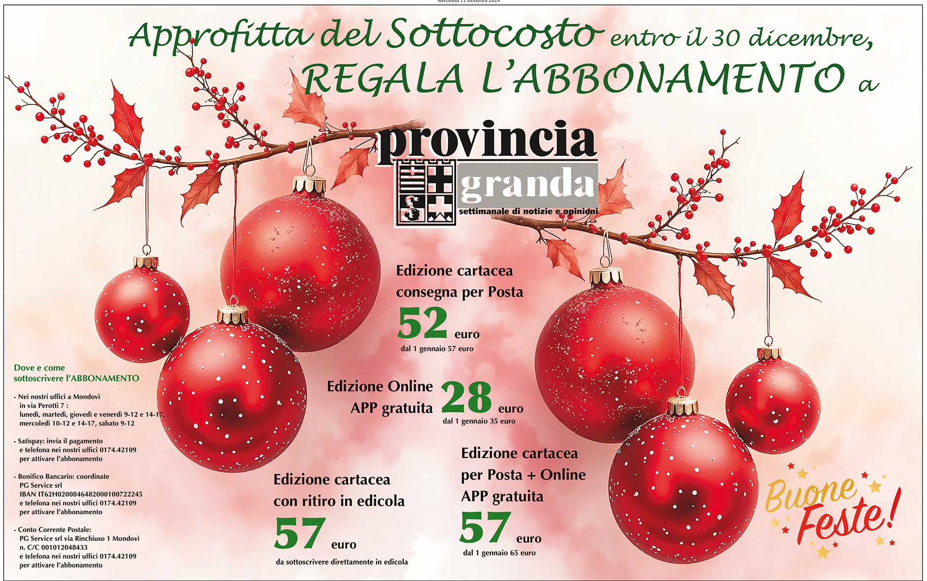 C'è ancora qualche giorno per approfittare della irripetibile promozione e regalare, rinnovare, attivare l'abbonamento alle "VOSTRE" notizie con "Provincia granda". FINO AL 30 DICEMBRE C'È IL SOTTOCOSTO!