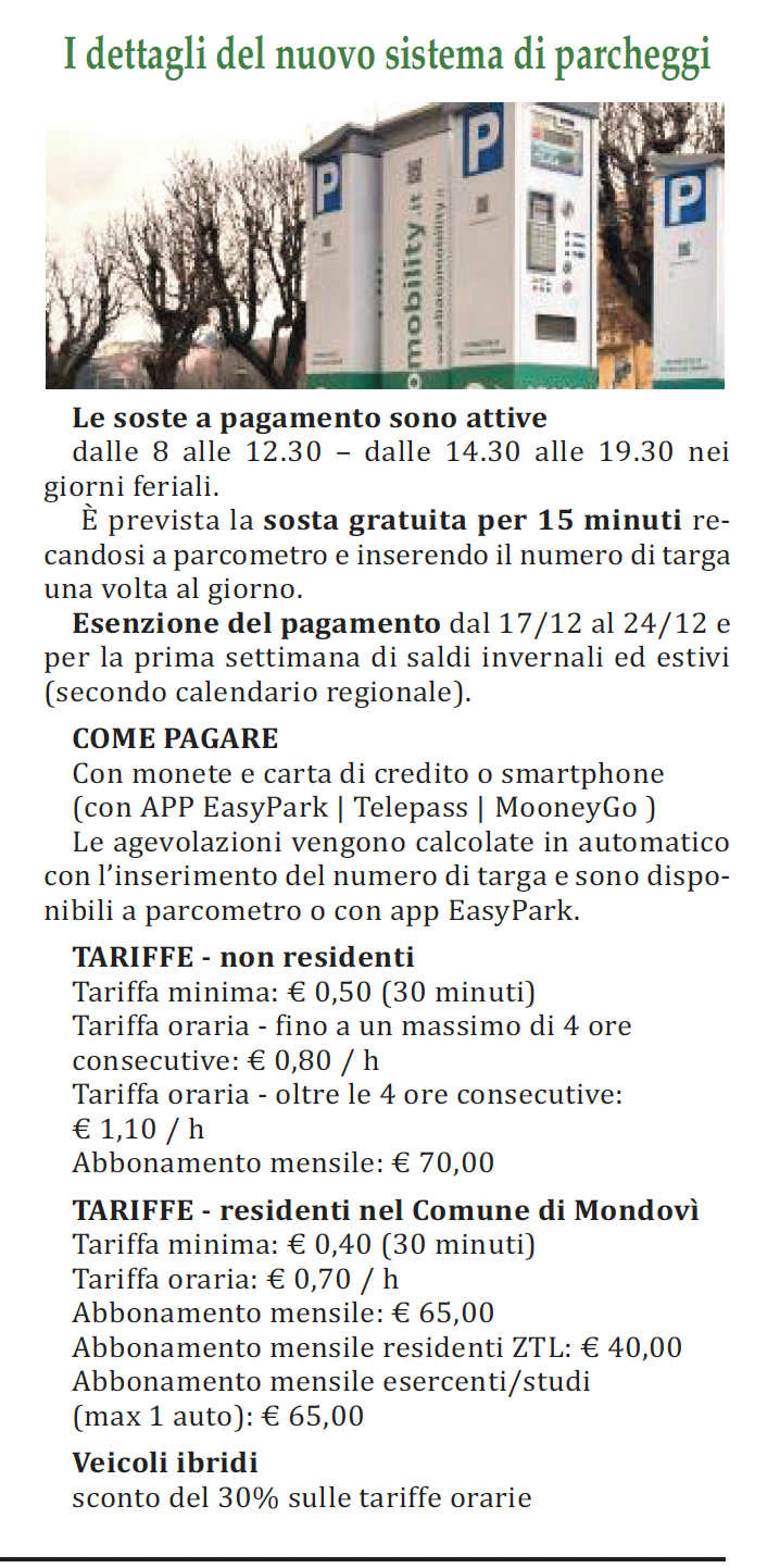 Pubblichiamo nuovamente, qui di seguito, i dettagli delle tariffe per il nuovo sistema dei parcheggi a Mondovì.