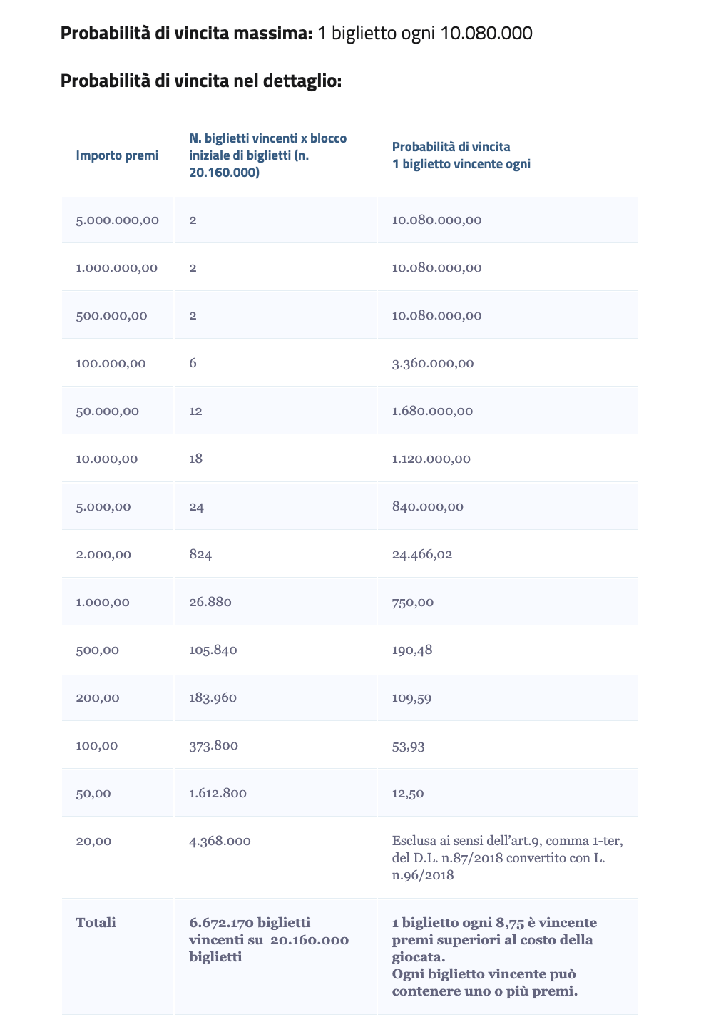 Vincita super a Mondovì. Alla tabaccheria “Corner Shop” di piazza Monteregale è stato vinto 1 milione di euro con il biglietto Gratta e Vinci da 20 euro. La giocata è stata validata il 12 febbraio per il concorso “100 x”. “Non abbiamo idea di chi possa essere il vincitore – dicono i gestori dell’esercizio, ma lo ringraziamo per aver acquistato il biglietto da noi”. Le probabilità di quella vincita per quel concorso le riportiamo qui sotto: nel caso di vincita di 1 milione di euro, la probabilità è pari a 1 biglietto vincente su oltre 1 milione. La vincita è tassata al 20%.