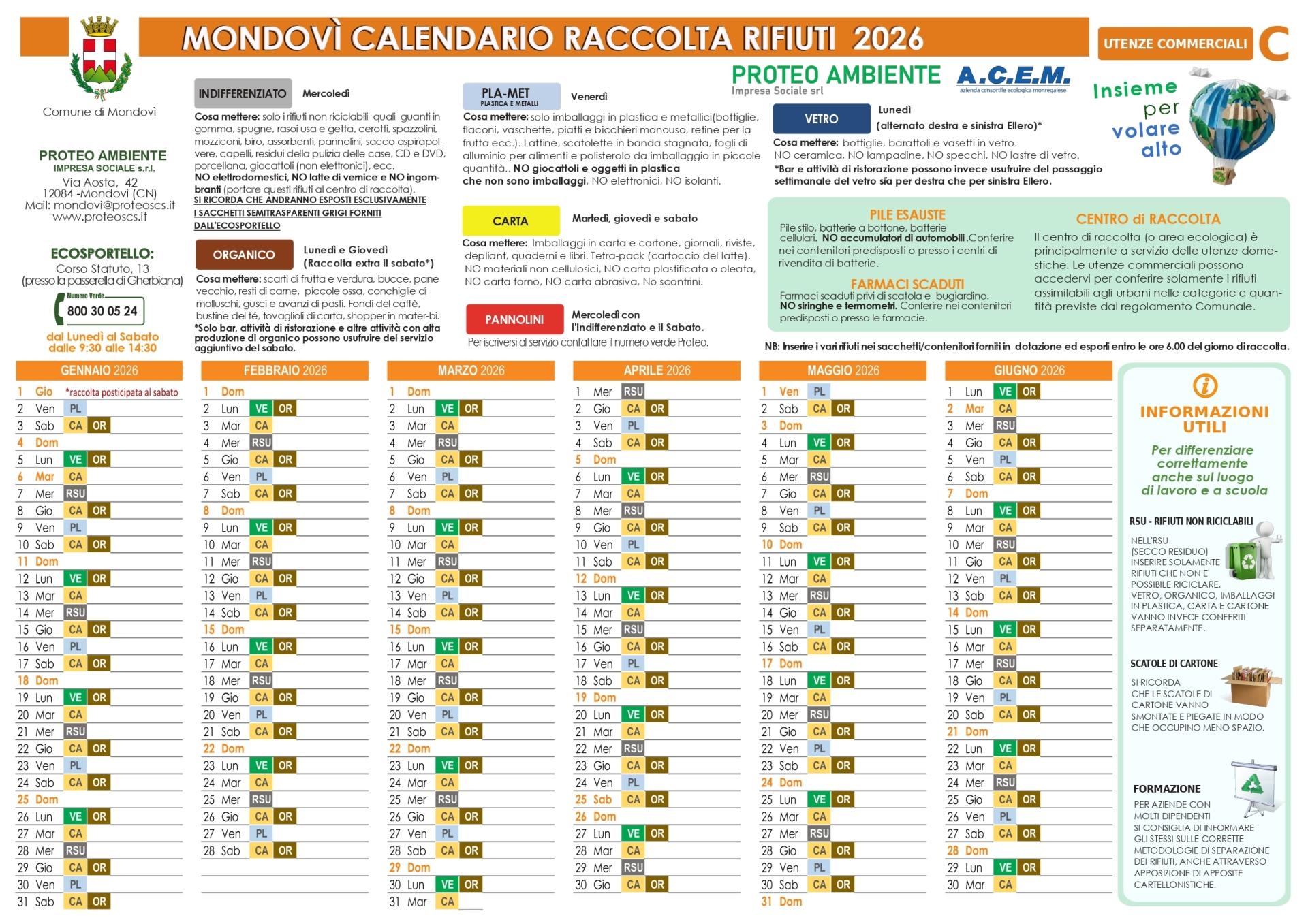 È pronto il nuovo calendario della raccolta rifiuti per le utenze commerciali nel Comune di Mondovì. Il servizio, gestito da Proteo Ambiente Impresa Sociale, definisce giorni di conferimento e modalità di esposizione per le diverse frazioni, con alcune specificità dedicate alle attività produttive e di ristorazione. Il calendario prevede una programmazione settimanale differenziata per indifferenziato, plastica e metalli, carta e cartone, vetro e organico, oltre a servizi dedicati come quello per i pannolini. Restano inoltre attivi i conferimenti separati per pile esauste e farmaci scaduti, da smaltire negli appositi contenitori. Particolare attenzione è posta alle modalità di conferimento, che richiedono l’utilizzo esclusivo dei sacchetti semitrasparenti grigi forniti dall’Ecosportello e l’esposizione dei rifiuti entro le ore 6 del giorno di raccolta. Per alcune tipologie di attività, come bar e ristoranti, sono previste raccolte aggiuntive legate all’elevata produzione di organico e vetro. Il centro di raccolta comunale resta principalmente a servizio delle utenze domestiche, mentre le utenze commerciali possono accedervi solo per i rifiuti assimilabili agli urbani, nel rispetto delle quantità stabilite dal regolamento comunale.