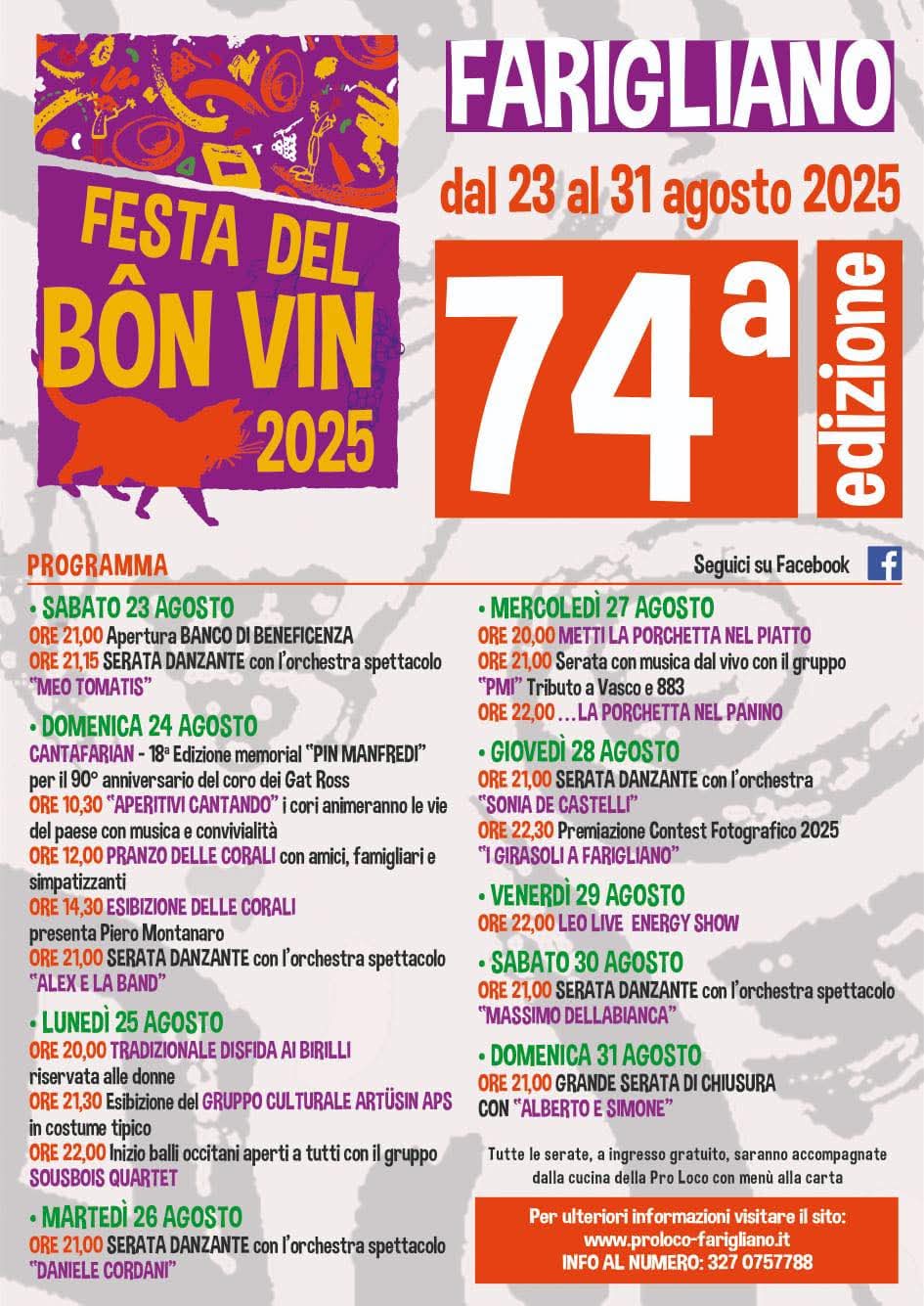 Anche quest’anno, come da tradizione, a Farigliano agosto si chiude con la “Festa del Bôn Vin”, manifestazione storica che giunge nel 2025 alla sua 74ª edizione. L’evento, organizzato dalla locale Pro Loco, si svolgerà dal 23 al 31 agosto e si preannuncia ancora una volta come un appuntamento imperdibile per il territorio: un mix ben riuscito di musica, convivialità, cultura popolare, gastronomia e folklore.