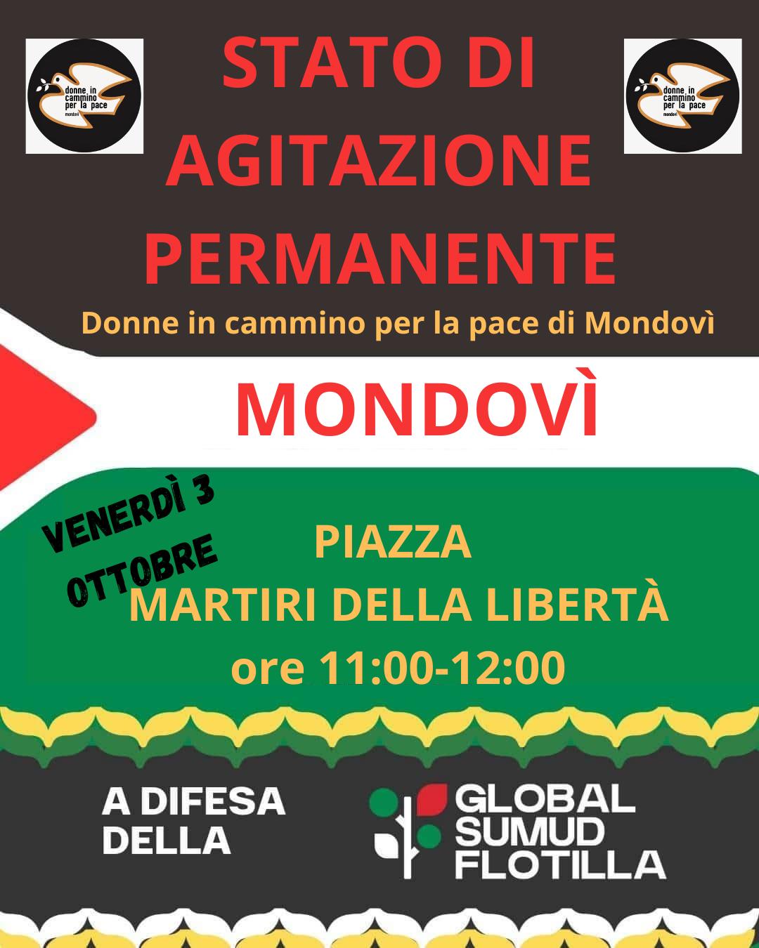 Le donne in cammino per la pace di Mondovì promuovono per domani (venerdì 3 ottobre) una manifestazione diurna (ogni sera si tiene nella stessa piazza il presidio giornaliero) in Piazza Martini della Libertà, di fronte al Municipio, dalle 11 alle 12, a difesa dell’azione della Global Sumud Flotilla. Nella stessa giornata è stato indetto lo sciopero generale dalla Cgil e dall'Unione sindacati di base.