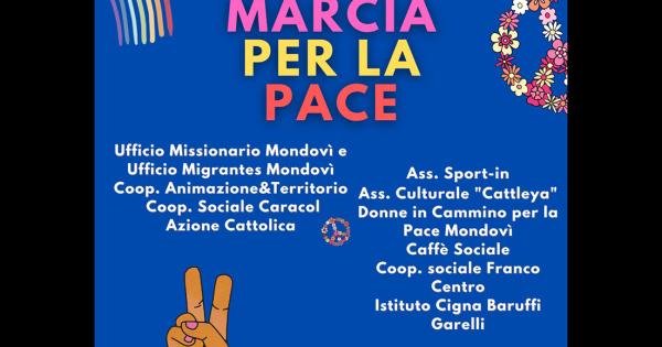 Il 22 maggio con ritrovo alle 18 in piazza del Mercato a Mondovi e partenza alle 18:30, si svolgera' la manifestazione "Marcia per la pace". Un' idea nata da alcuni cittadini e associazioni per dare un segnale ed un messaggio forte e chiaro di pace, di condivisione dei valori di fratellanza È una manifestazione apolitica, un invito esteso a tutti, cittadini piccoli e grandi, associazioni ed enti, un momento da vivere insieme, da diffondere a tutti. Insieme per fare la differenza. La marcia inizierà alle 18.30, il tragitto è accessibile a tutti e si snoderà nel centro di Mondovì, passando per via Alessandria e via Sant'Agostino giungendo nella piazza di fronte al Comune (piazza Martiri della Libertà). Per qualsiasi informazione scrivere a giacardia@gmail.com o telefonare a 366 971 1486.