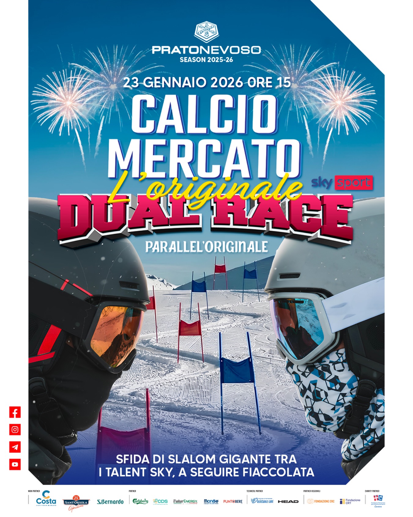 La settimana di Sky Calciomercato L’Originale sulle nevi di Prato Nevoso si chiuderà domani, venerdì 23 gennaio, con la Dual Race “Parallel’Originale” in cui giornalisti e talent si cimenteranno in un gigante parallelo dalle ore 15. Sfide ad eliminazione diretta fino alla finalissima, a seguire, subito dopo il tramonto, un’emozionante fiaccolata per una giornata indimenticabile in cui si potranno conoscere da vicino i volti noti di Sky e del grande calcio.