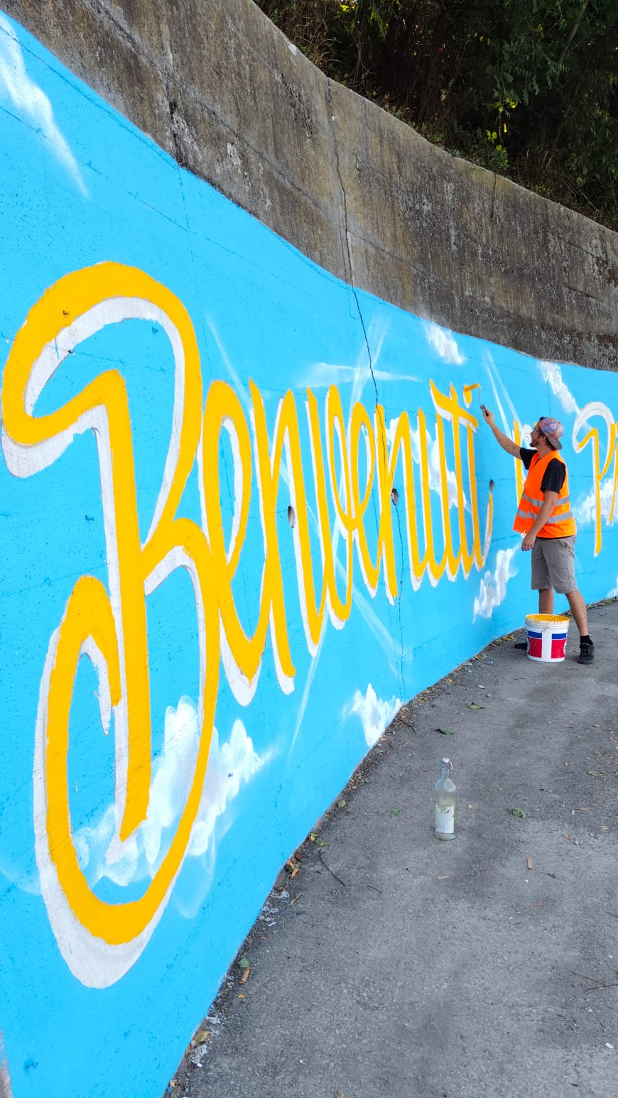 Una nuova opera d’arte rende più bello l’ingresso a Pianfei, sulla salita dei Fulcheri. Lunga 14 metri e alta 2, è stata realizzata in due giorni con le bombolette spray dal giovane artista Benjisgraff.
