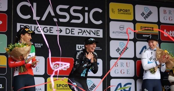 Il podio della Brugge De Panne , in tricolore Balsamo applaude alla vincitrice Georgi - foto Facebook Brugge De Panne