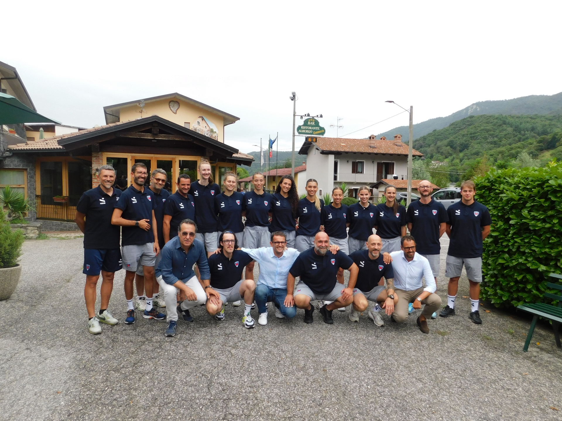 Giocatrici, staff e dirigenza davanti all'Albergo Commercio di Norea