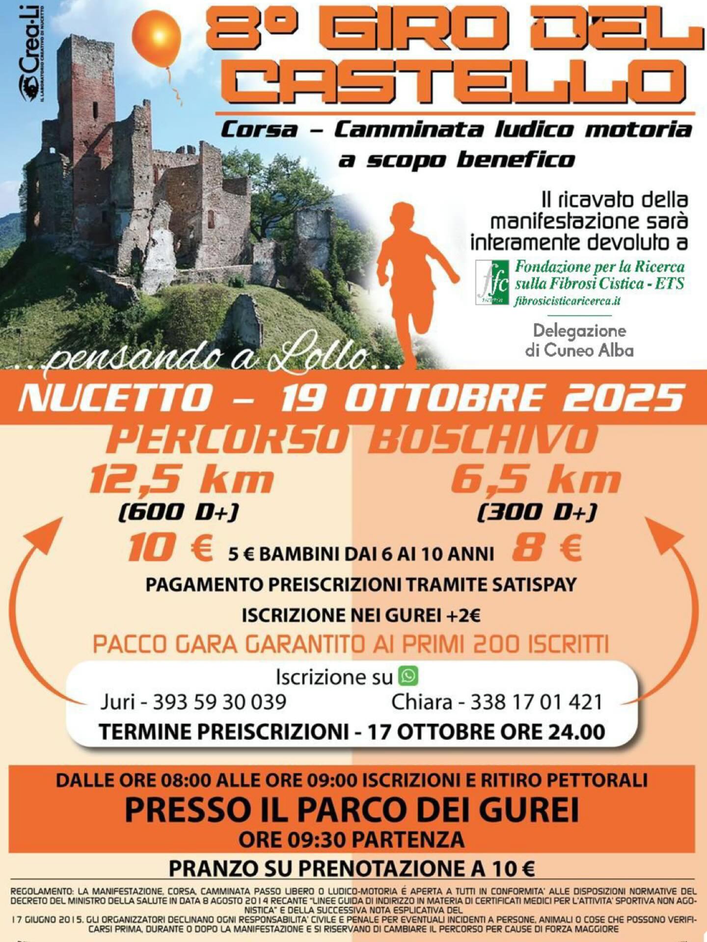 Domenica (19 ottobre) si terrà a Nucetto l’ottavo Giro del Castello, camminata ludico-motoria su un doppio percorso: 12,5 km con 600 m. di dislivello positivo e 6,5 (300 m. d+). L’intero ricavato sarà devoluto alla Fondazione per la Ricerca sulla Fibrosi Cistica. Ritrovo dalle 8 al Parco dei Gurei, partenza alle 9.30. Il costo è € 10 per il lungo, di 8 per il corto e di 5 per bambini 6-10 anni, Il pacco gara è garantito ai primi 200 iscritti, pre-iscrizioni entro il 17 ottobre su Whatsapp a Juri 393.5930039 per il lungo ed a Chiara 338.1701421 per il corto (pagamento su Satispay). In loco iscrizioni maggiorate di 2 euro, il pranzo su prenotazione costa 10 euro.