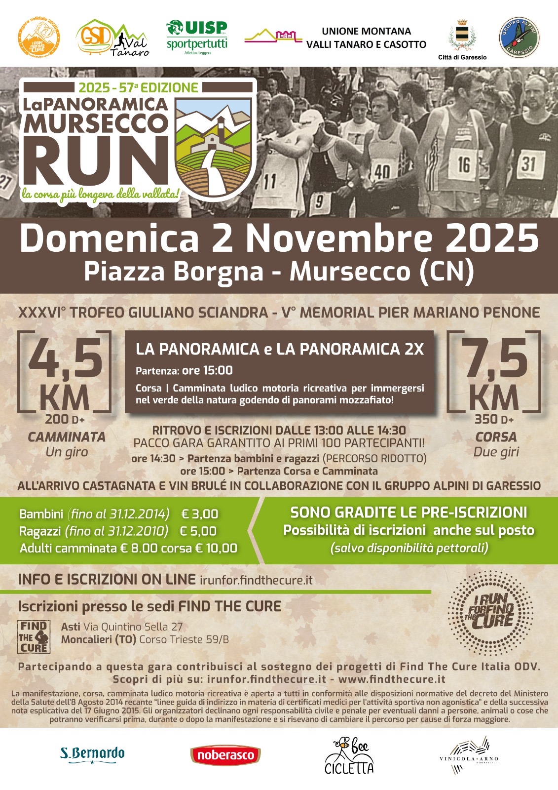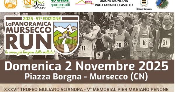 Torna domenica (2 novembre) la gara più longeva della Val Tanaro: “La Panoramica Mursecco Run” organizzata sotto l’egida Uisp unitamente da I Run For Find The Cure, le famiglie Sciandra e Penone (in palio il 36° Trofeo Giuliano Sciandra ed il 5° Memorial Pier Mariano Penone), il GSD Val Tanaro ed il Comune di Garessio. L’incasso aiuterà il progetto Home Sweet Home, fondo per il sostegno alla messa in sicurezza abitativa nei territori africani sostenuti da Find The Cure...