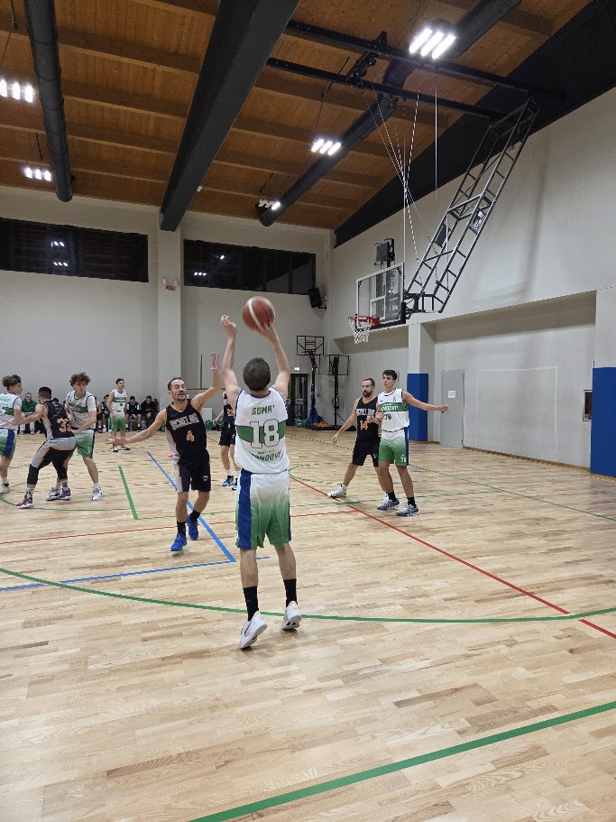 Si torna a respirare il calore del PalaBCM per la terza di campionato ed i biancoverdi, eccezionalmente senza il play titolare Camperi, sono desiderosi di confermare la splendida vittoria in rimonta di Bussoleno. Di fronte, un Nichelino in fiducia, dopo il successo casalingo sul Savigliano, e pronto a dare battaglia. L’avvio è frizzante: Mondovì impone subito ritmo e aggressività difensiva, ma gli ospiti rispondono colpo su colpo. Turco apre le marcature con un bel movimento spalle a canestro, poi Somà (nella foto sotto al tiro) inizia il suo show dall’arco, realizzando con precisione chirurgica.