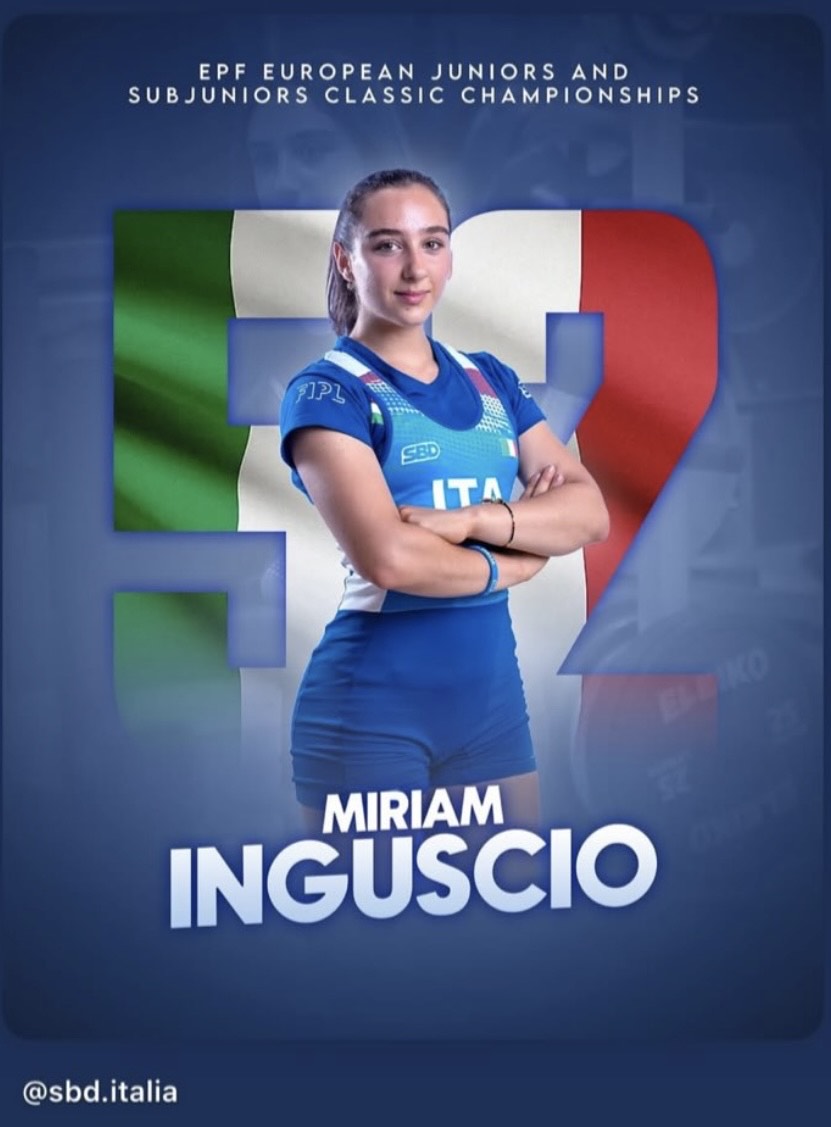 Venerdì (28 novembre) la monregalese Miriam Inguscio sarà in gara agli Europei Junior e Sub Junior di Powerlifting nella città termale di Druskininkai, in Lituania. È arrivata l’attesa convocazione in Nazionale per la classe 2007 che a febbraio aveva ottenuto la qualifica con un totale di 360 kg., qui l'anticipazione della chiamata in azzurro a maggio. Ad aprile Miriam aveva fatto suo il record italiano Classic nello stacco da terra, categoria -57 kg, con 170, migliorato poi a settembre, sempre a Lodi, di 500 g. vincendo il Trofeo Next Generation (quinta assoluta). Inoltre, a luglio con 78 kg ha realizzato quello Classic di distensioni su panca nella -52 kg (vittoria nella Coppa Bertoletti).