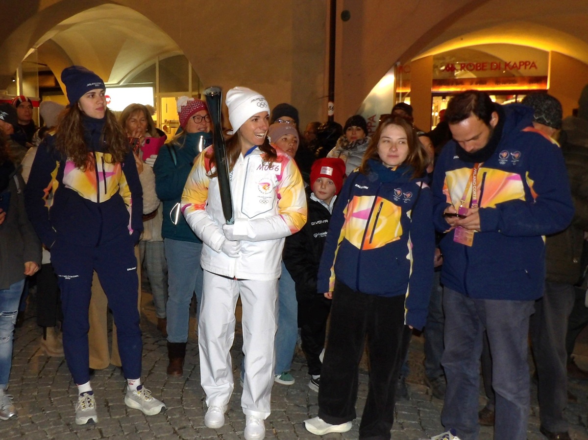 La penultima tedofora in via Roma a Cuneo era la campionessa azzurra di sci alpino Marta Bassino che accompagnata dal calore della folla ha consegnato la fiamma olimpica ad Elisa Rigaudo