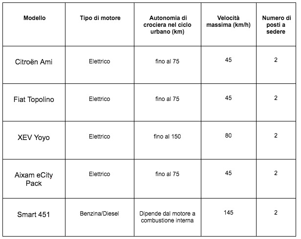 Nel 2024, Citroën Ami, Fiat Topolino, XEV Yoyo, Aixam eCity Pack e Smart 451 erano popolari tra queste auto.
